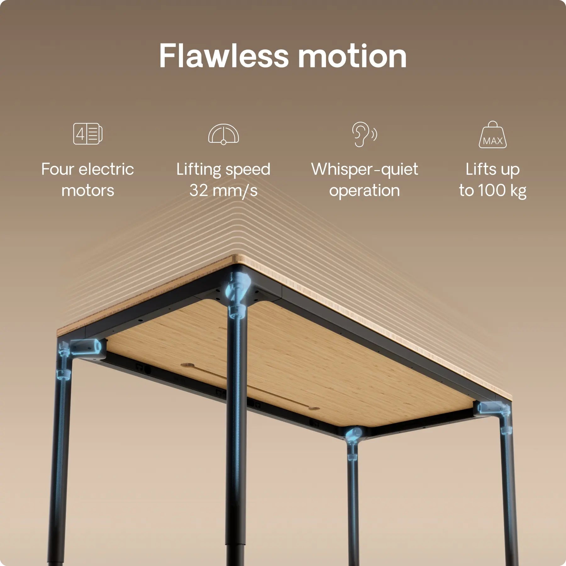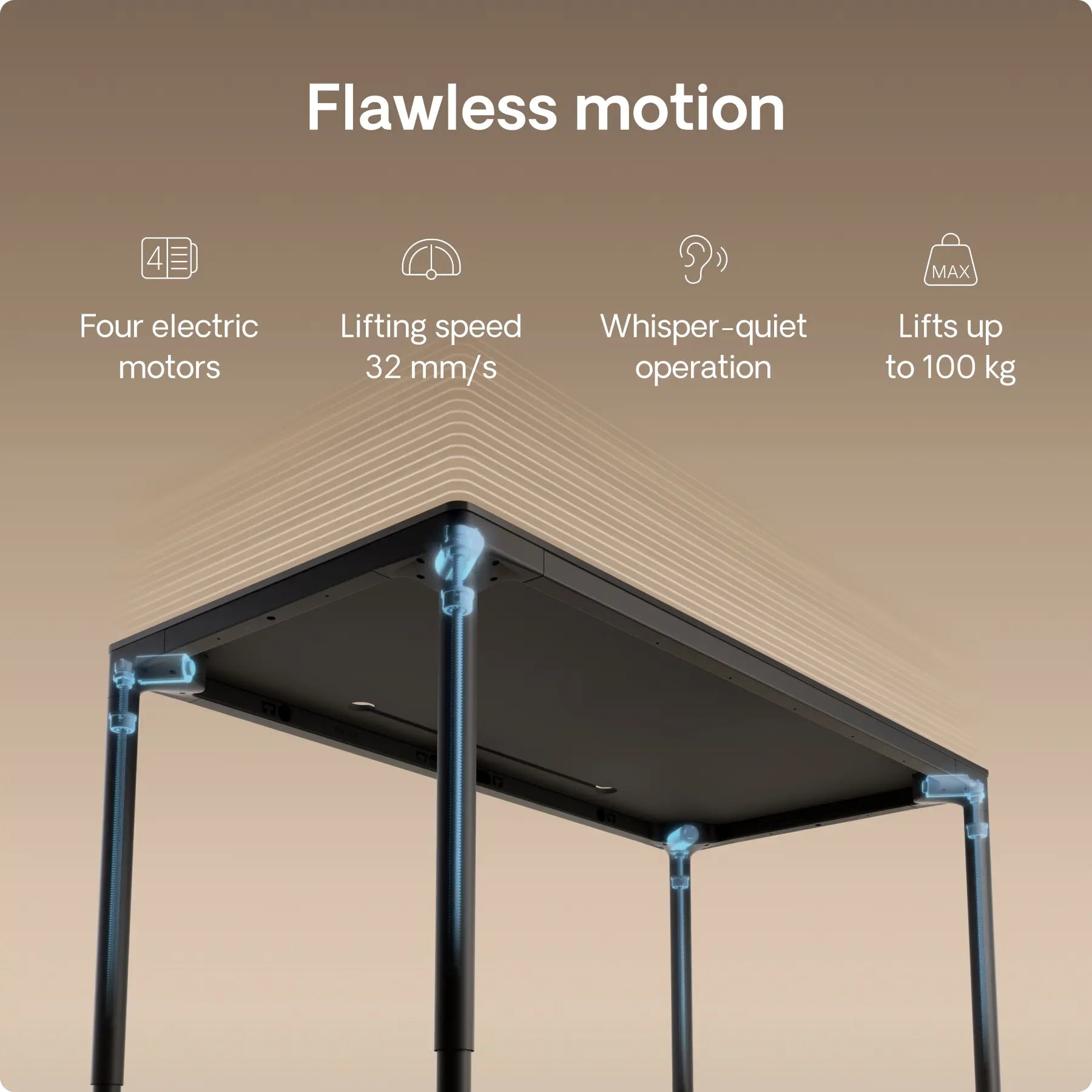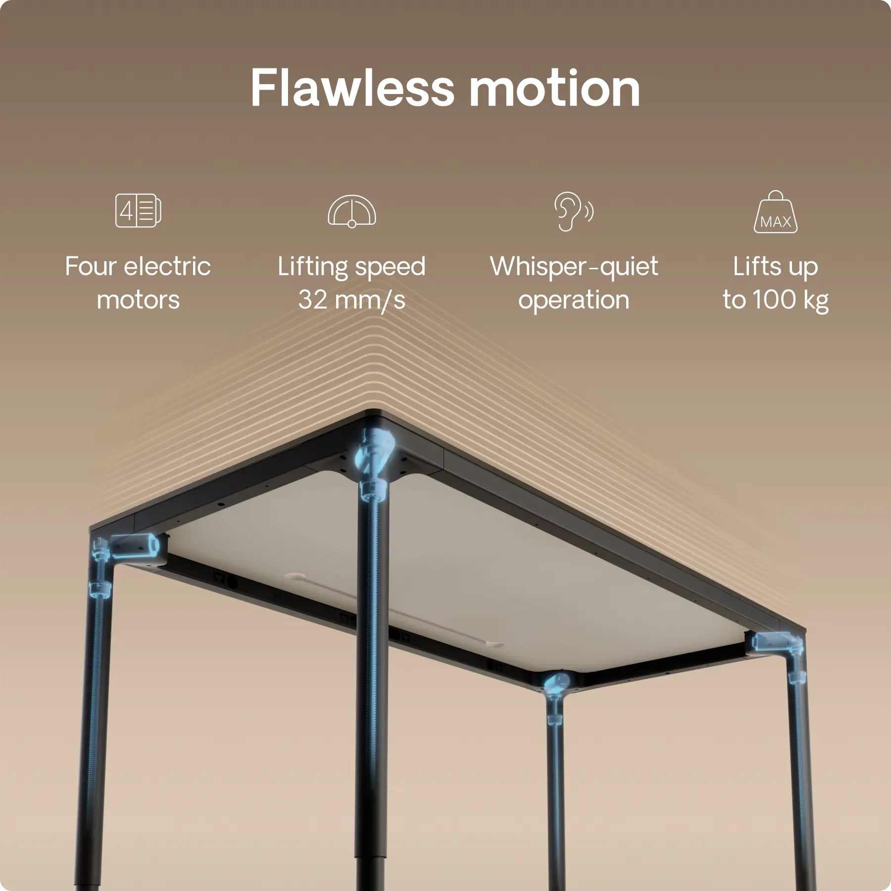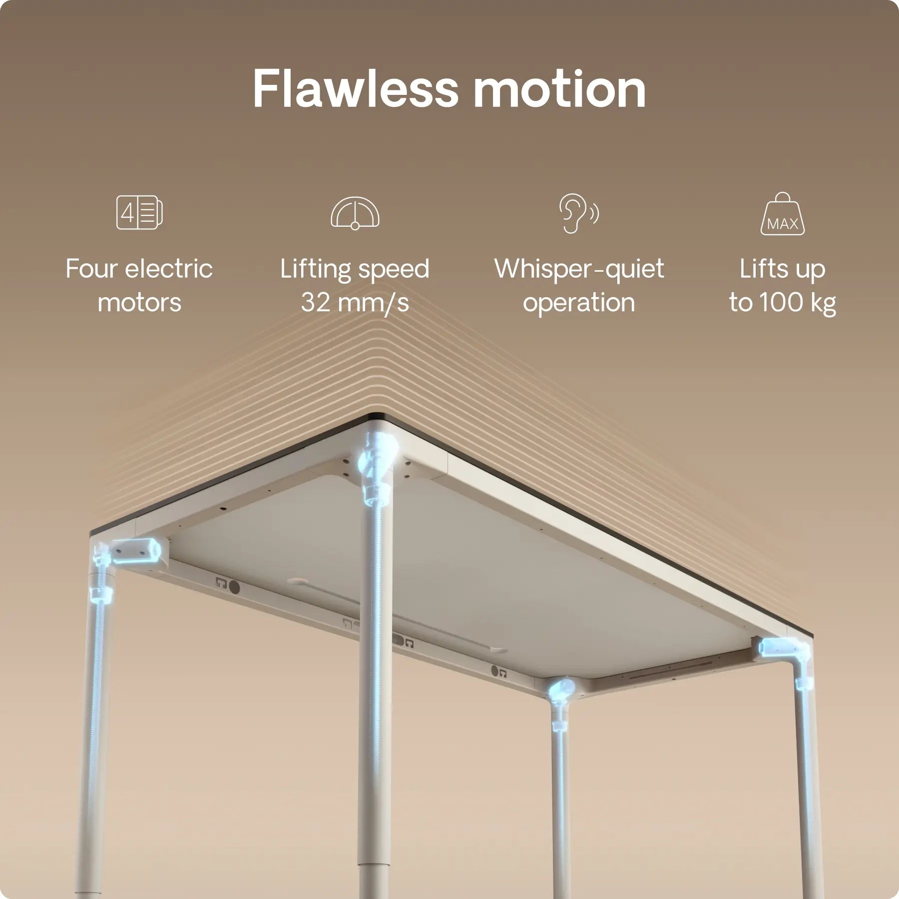 Four precision in-line motors, hidden inside each leg, power this height adjustable desk with silent strength and perfect synchronization – moving up to 32 mm/s. Twice the power. Effortless motion. Built to last.
