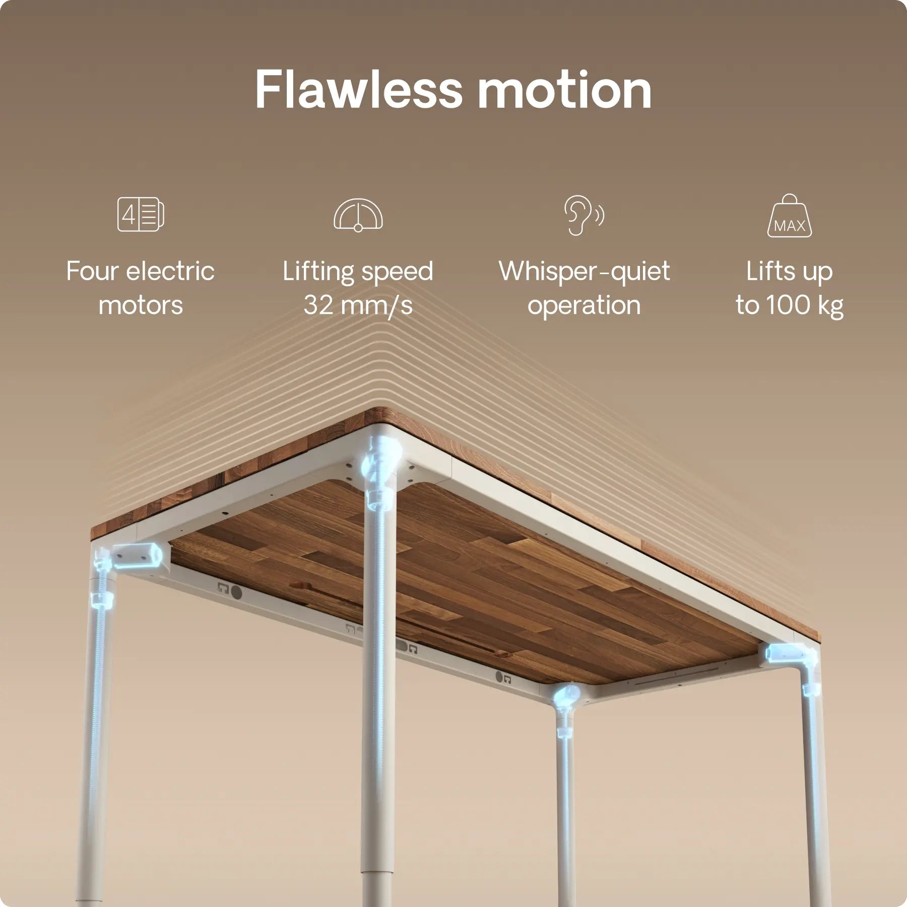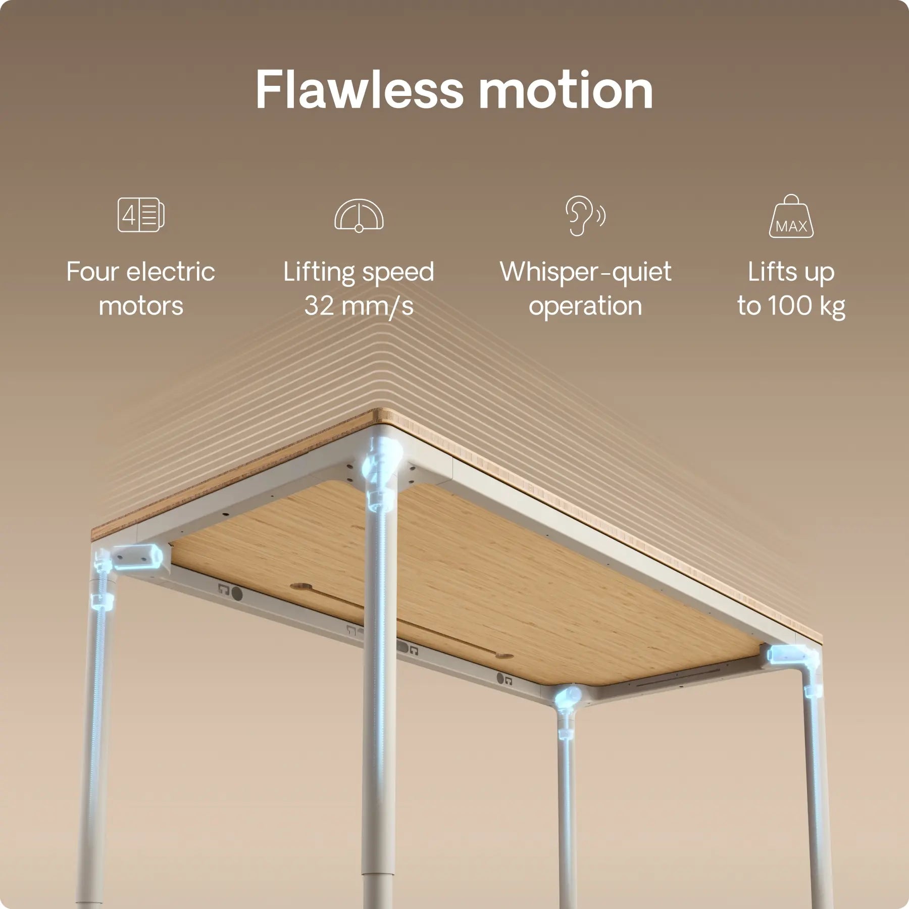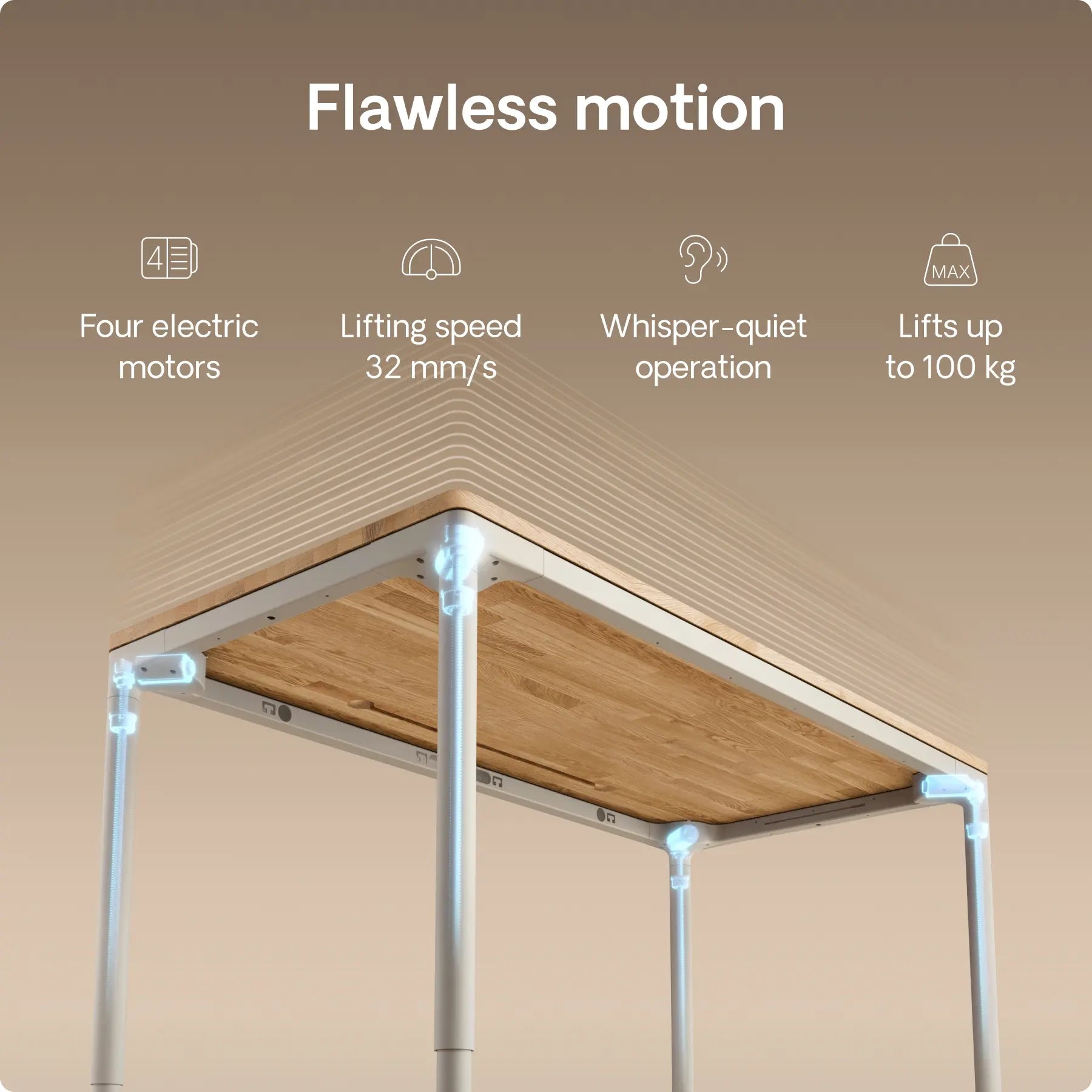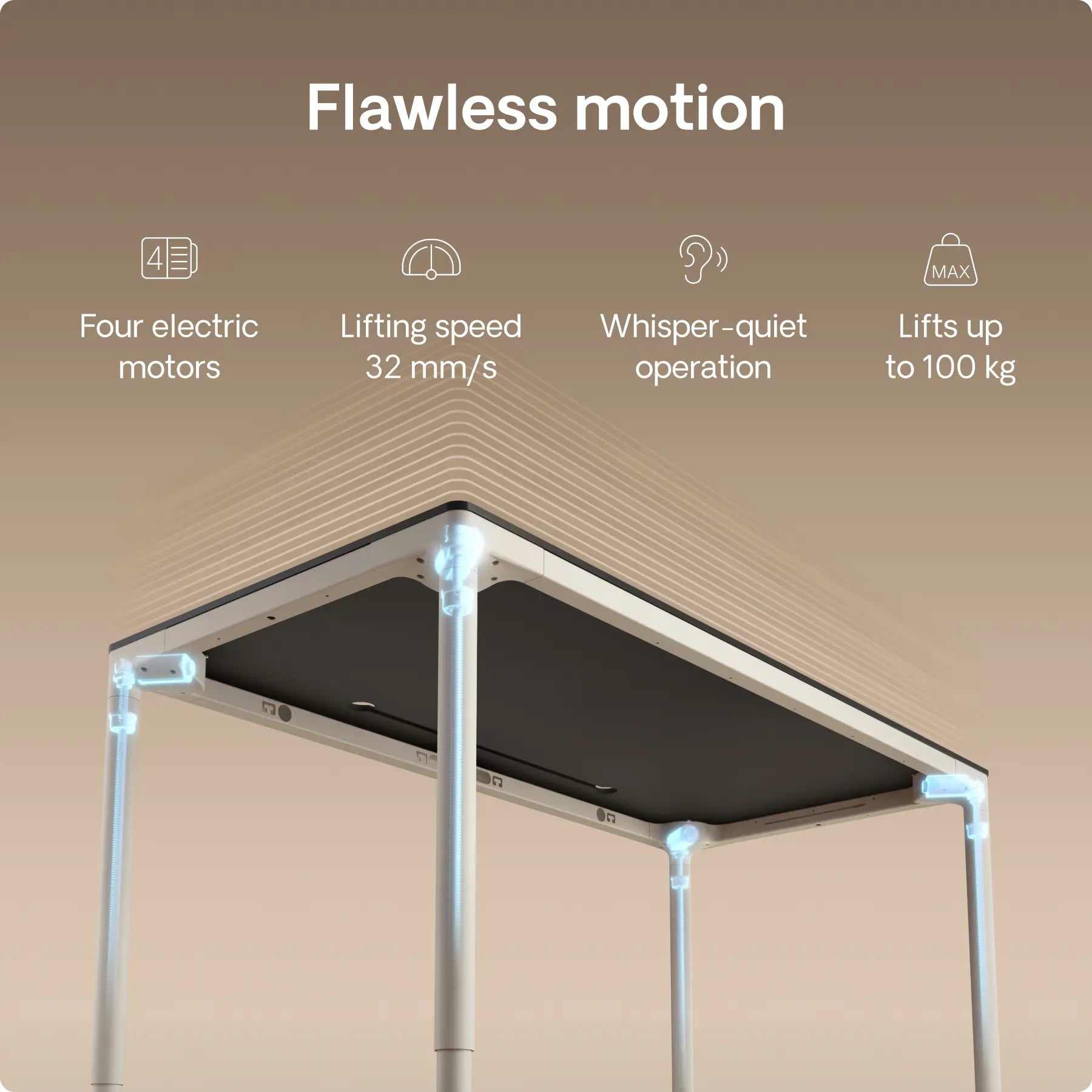 Experience near instant height adjustments with just one touch as the table effortlessly reaches your preferred height at 30 mm/s.