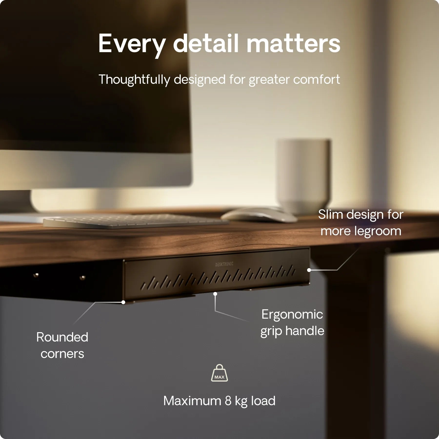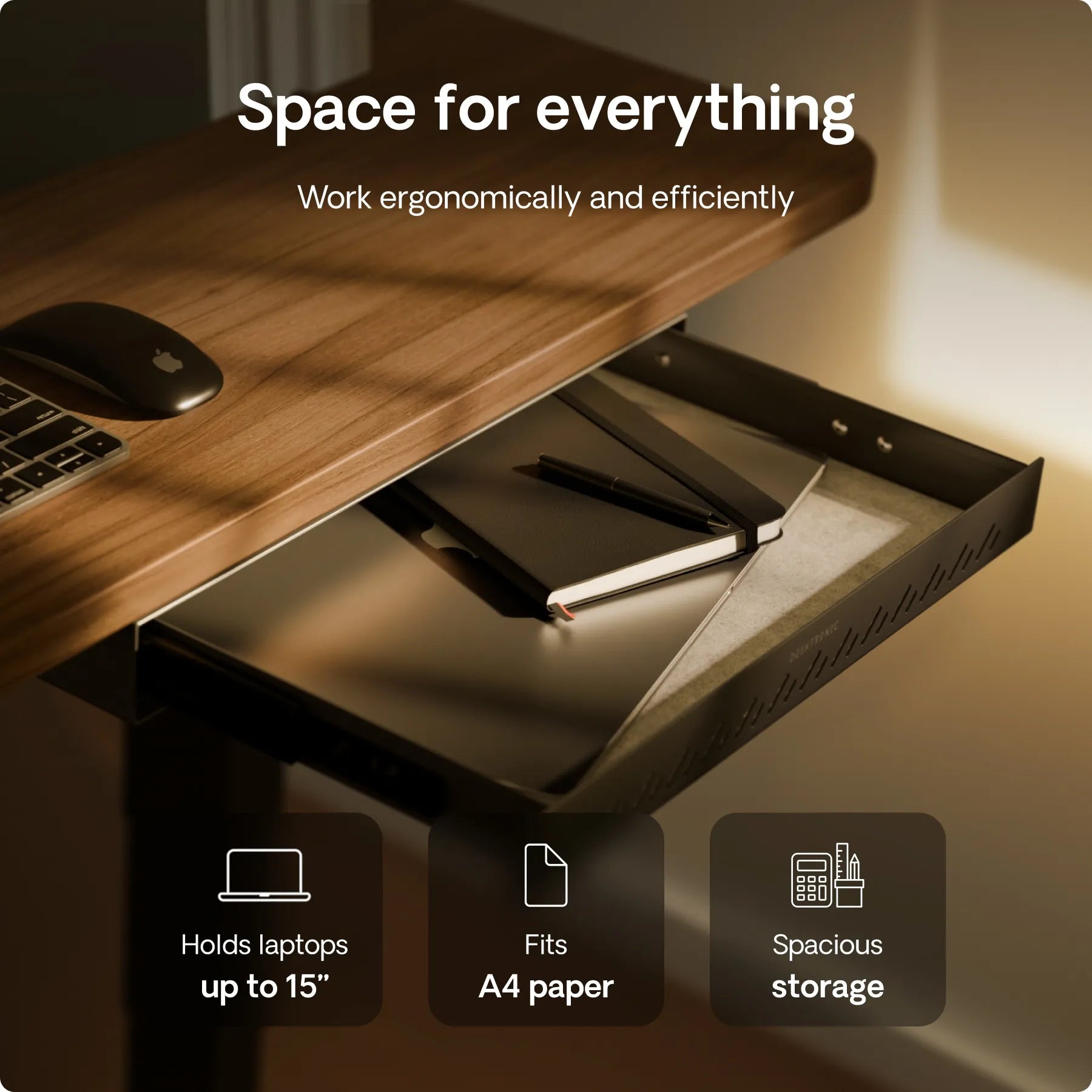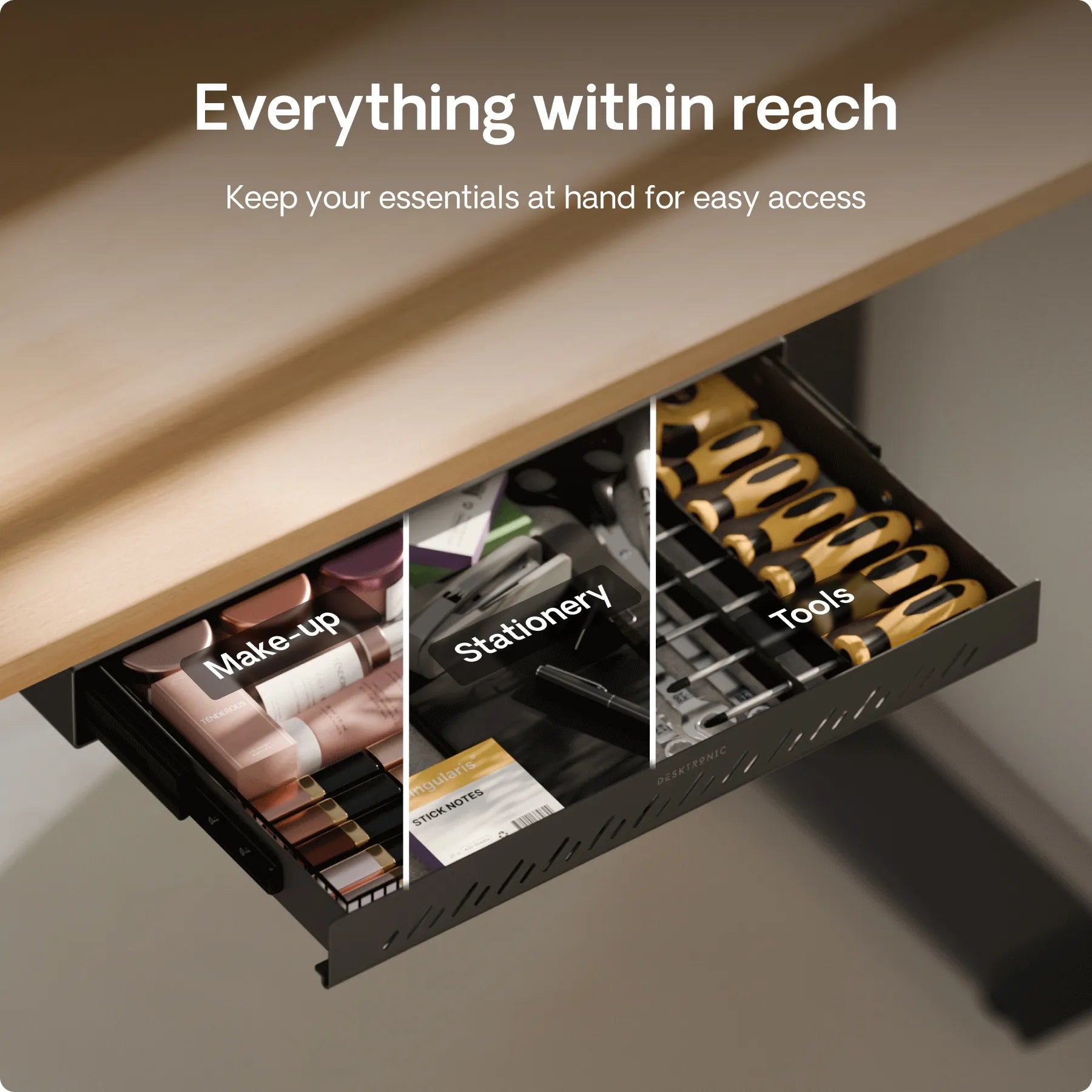 The Desk Drawer earns praise for its slim profile, solid metal build, and smooth-glide rails that open quietly every time. Buyers appreciate the space it creates for documents and essentials, keeping desks organized and clutter-free. Durable and stylish, with a 2-year warranty, it’s a big change that makes daily work easier.