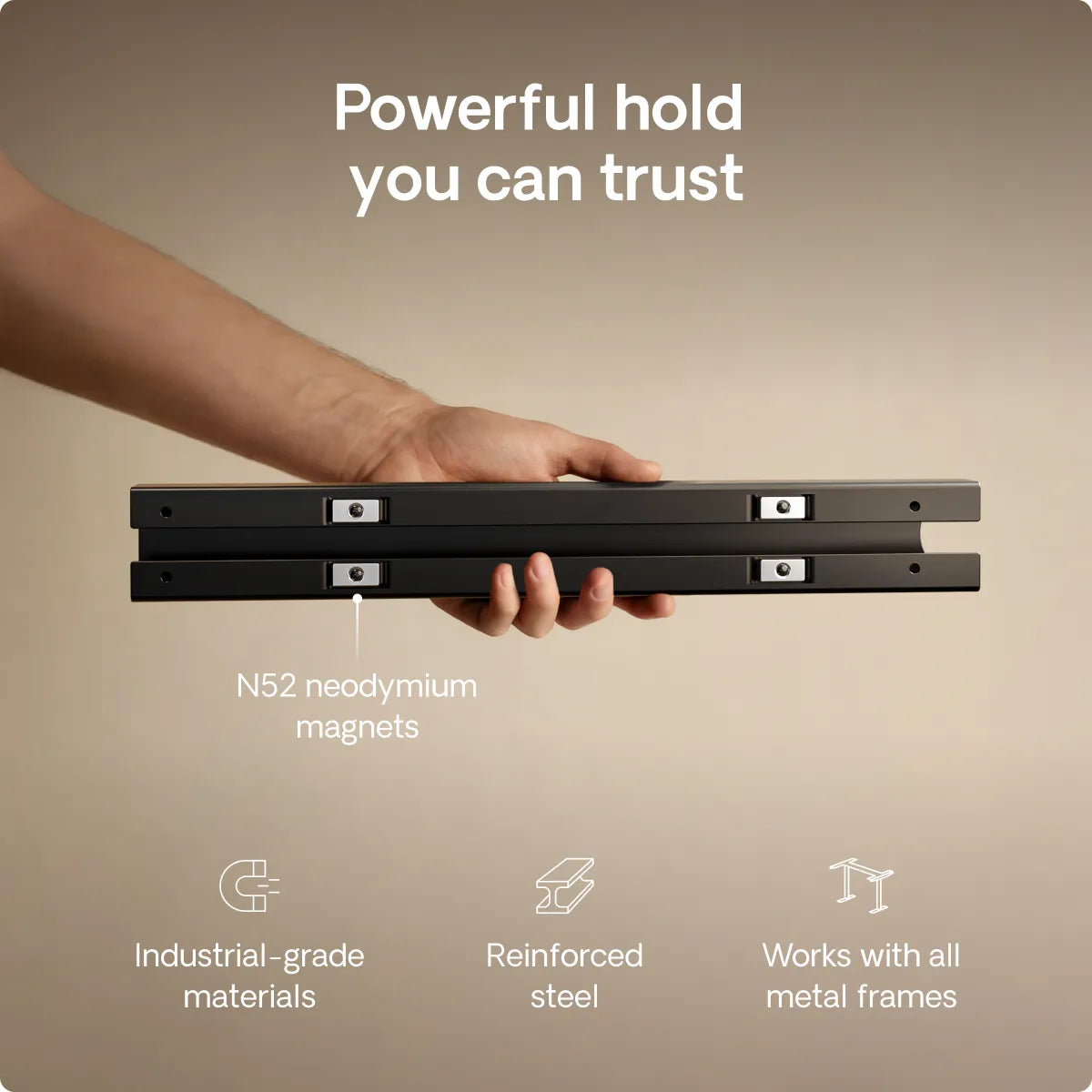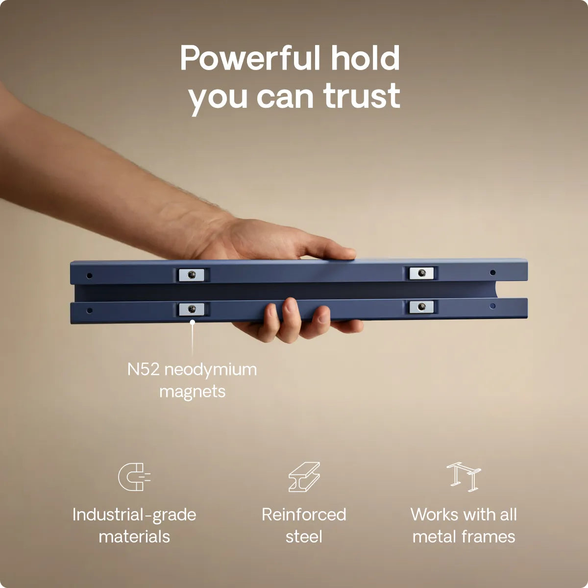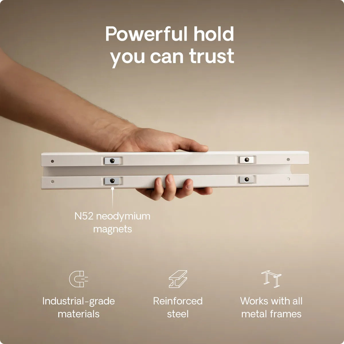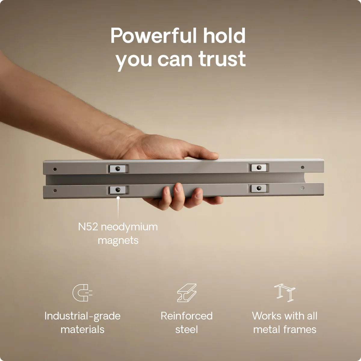 Installation is instant. Simply snap it onto any metal surface of your desk frame – vertical or horizontal. Strong magnets hold it in place, and you can reposition it anytime without tools.