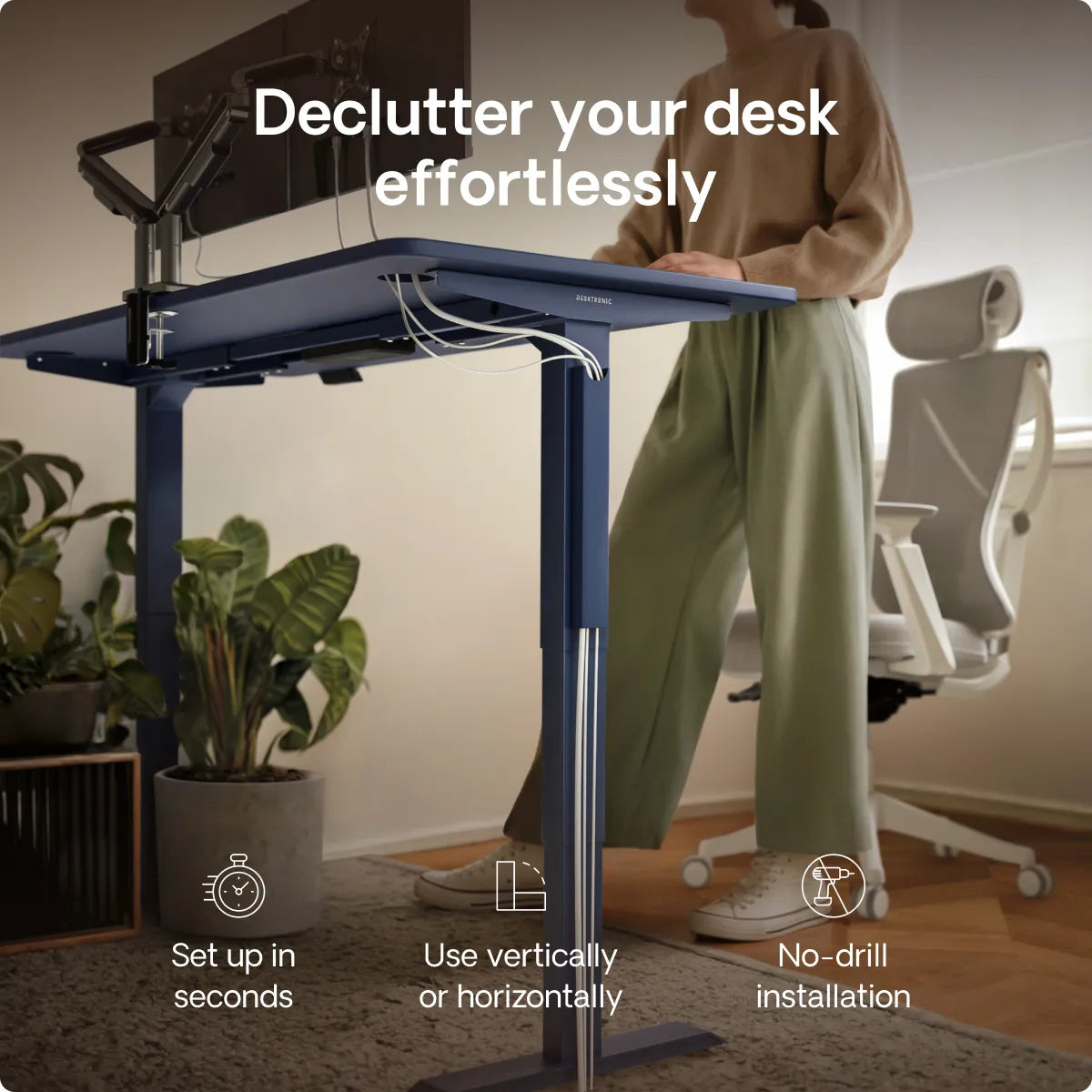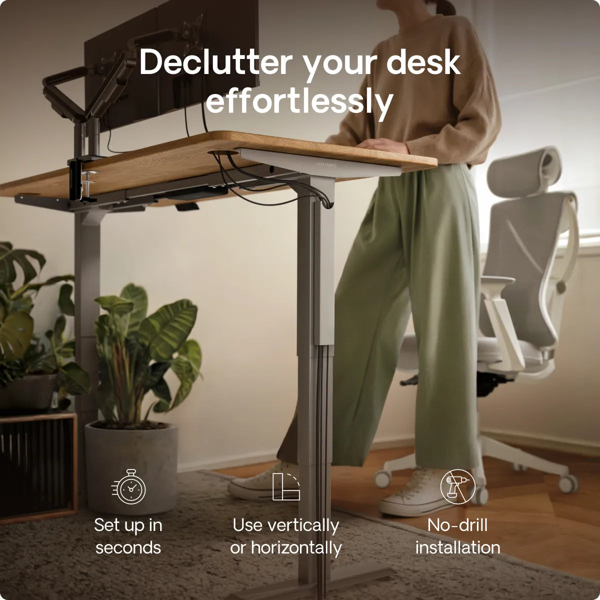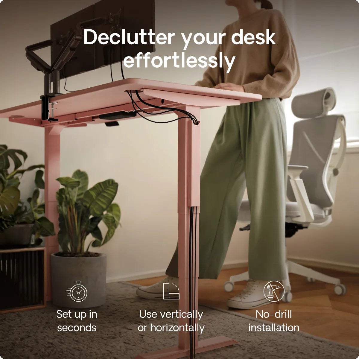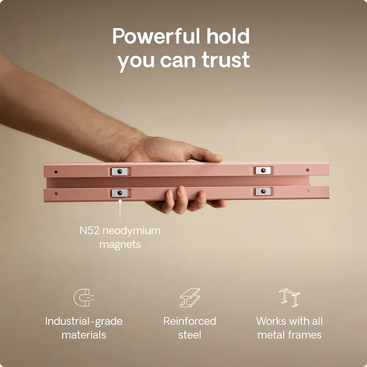 Installation is instant. Simply snap it onto any metal surface of your desk frame – vertical or horizontal. Strong magnets hold it in place, and you can reposition it anytime without tools.