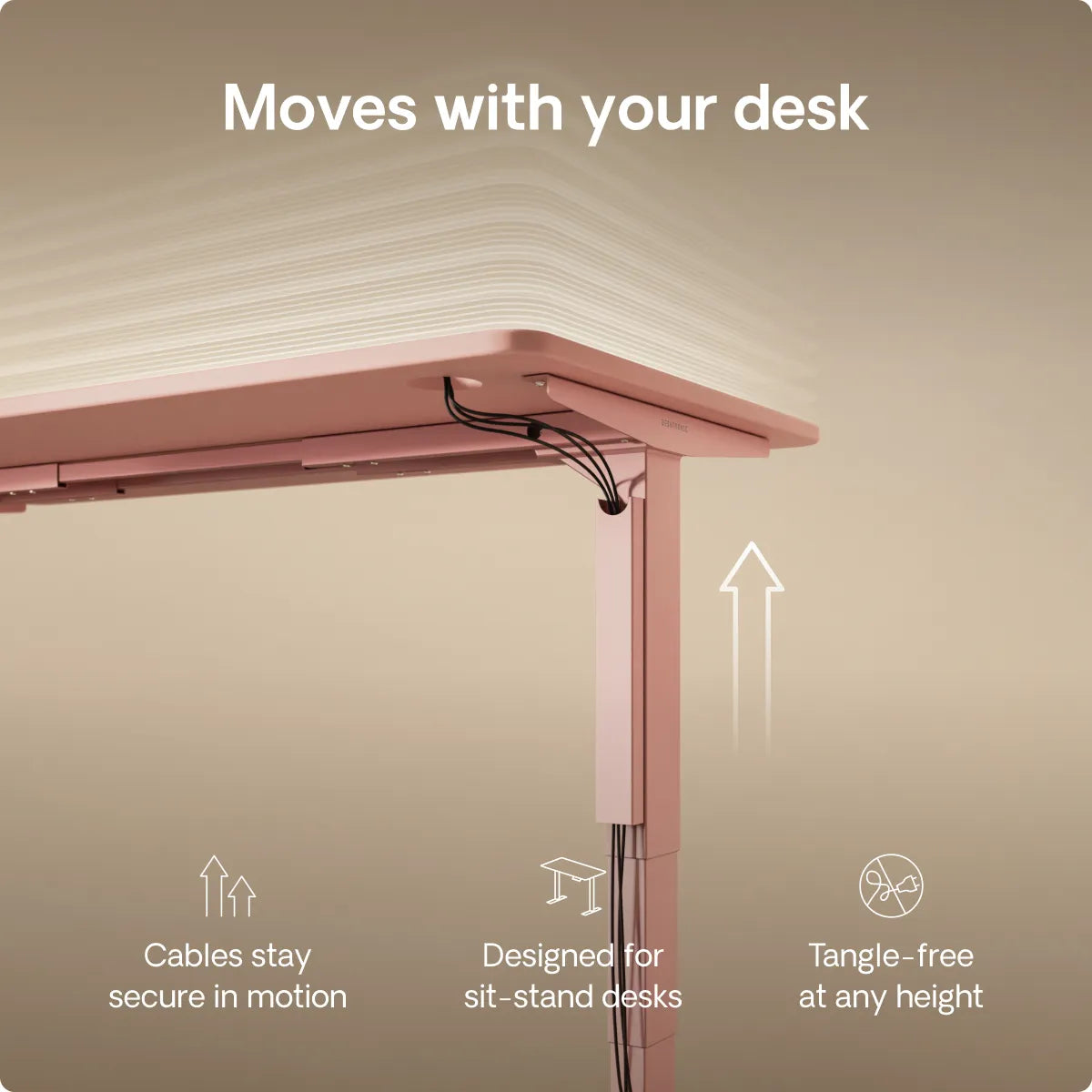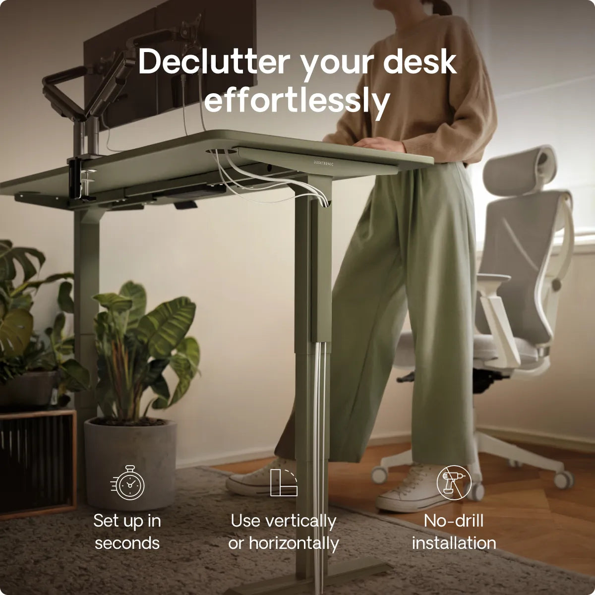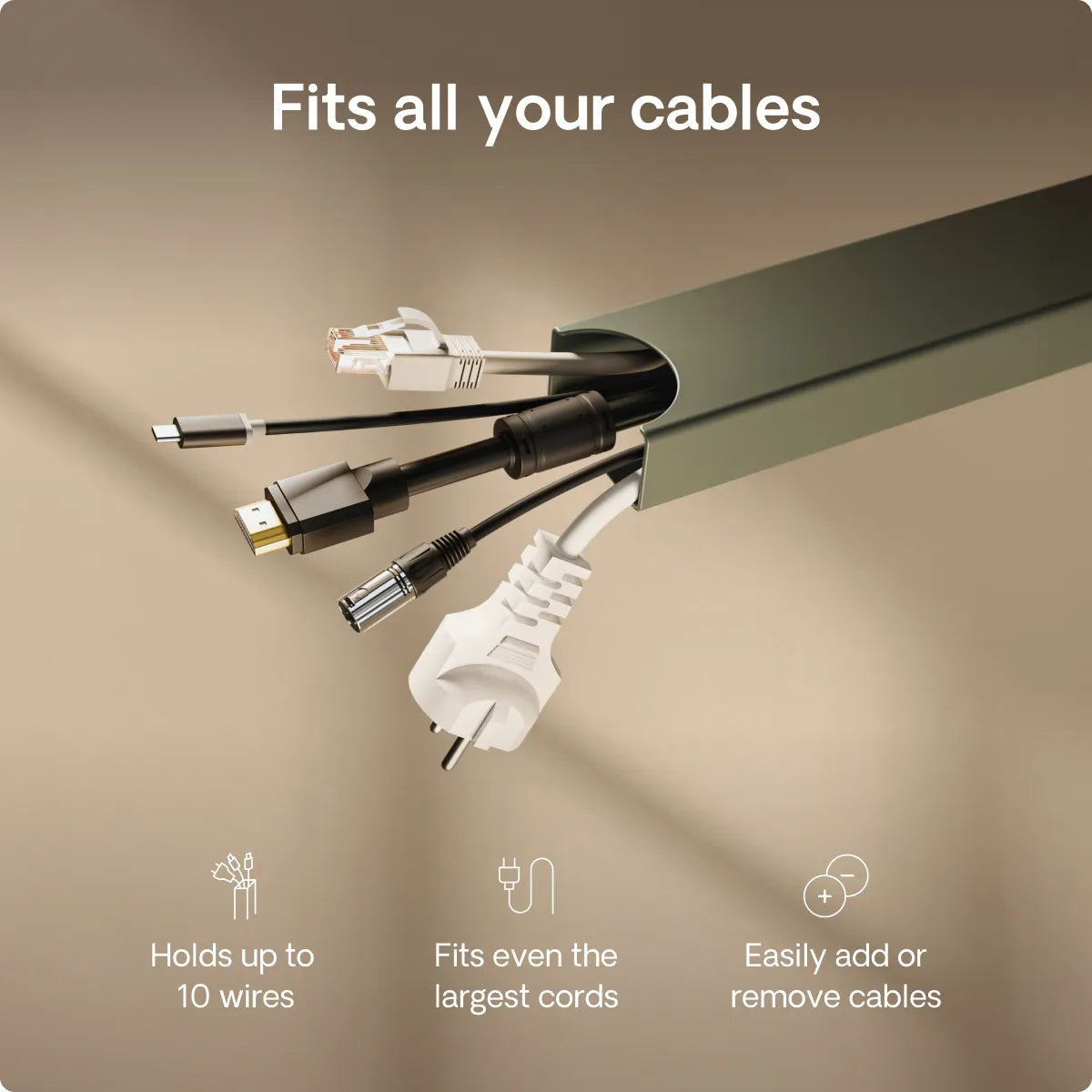 The Magnetic Cable Channel comes in the same finishes as our standing desk frames for a seamless match: Black (RAL9005), White (RAL9016), and Grey (RAL9006). It is also available in Limited Edition colours – Muted Pink (Pantone 7612 U), Olive Green (Pantone 4227 C), and Midnight Blue (Pantone 2379 C).