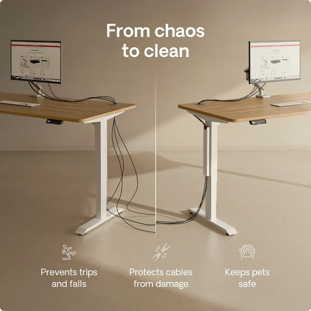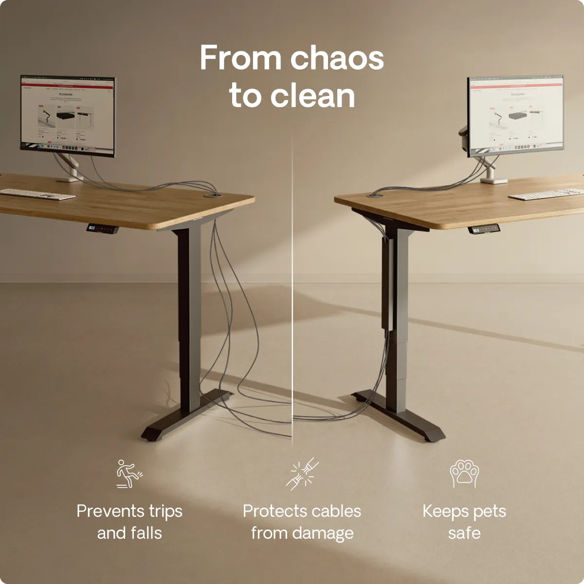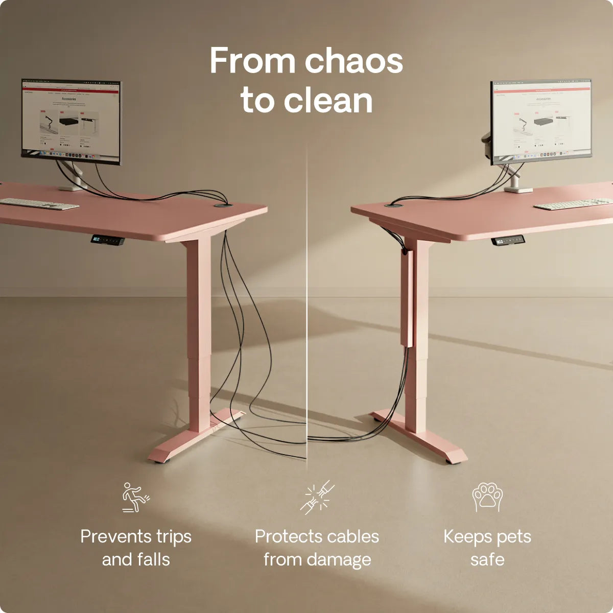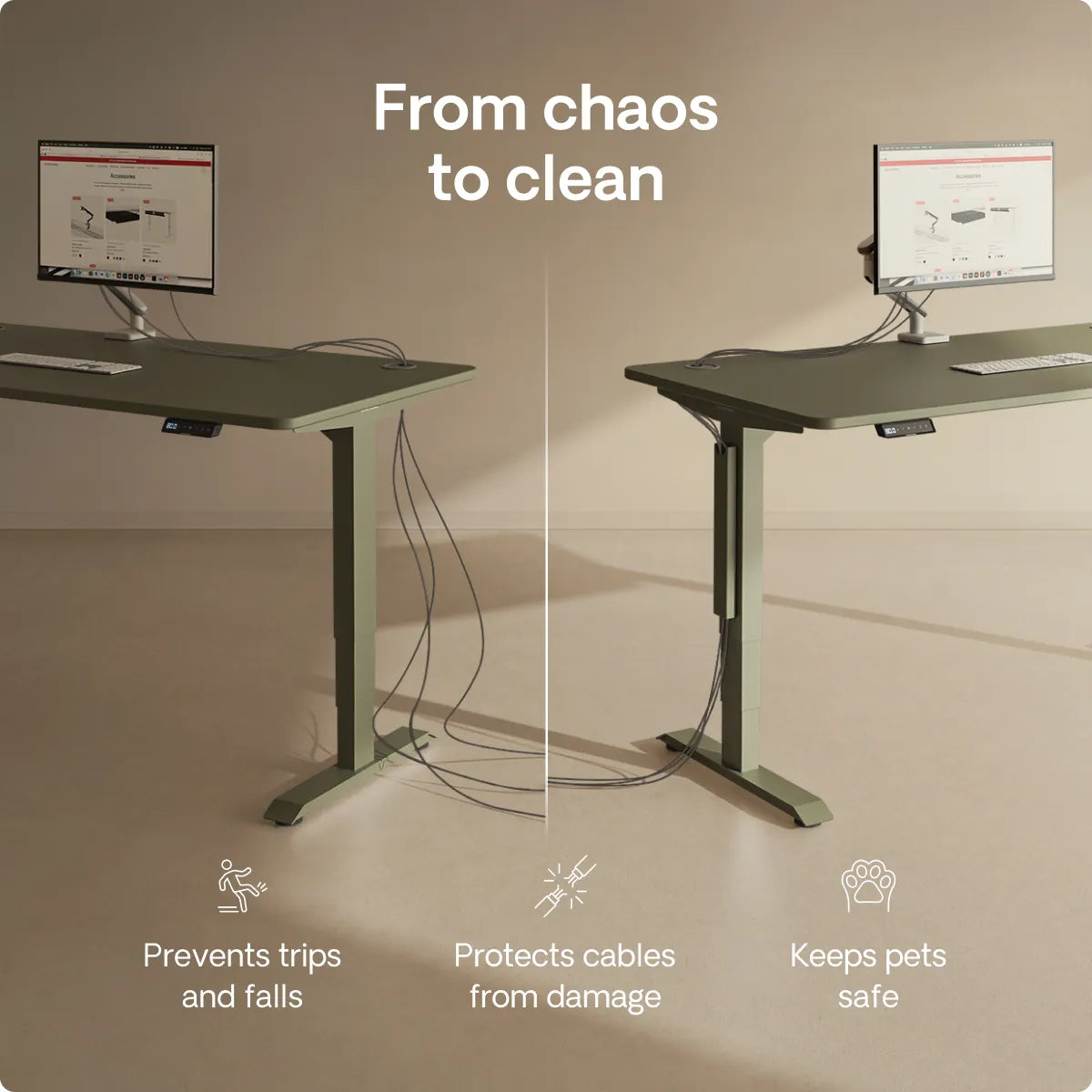 The Magnetic Cable Channel comes in the same finishes as our standing desk frames for a seamless match: Black (RAL9005), White (RAL9016), and Grey (RAL9006). It is also available in Limited Edition colours – Muted Pink (Pantone 7612 U), Olive Green (Pantone 4227 C), and Midnight Blue (Pantone 2379 C).