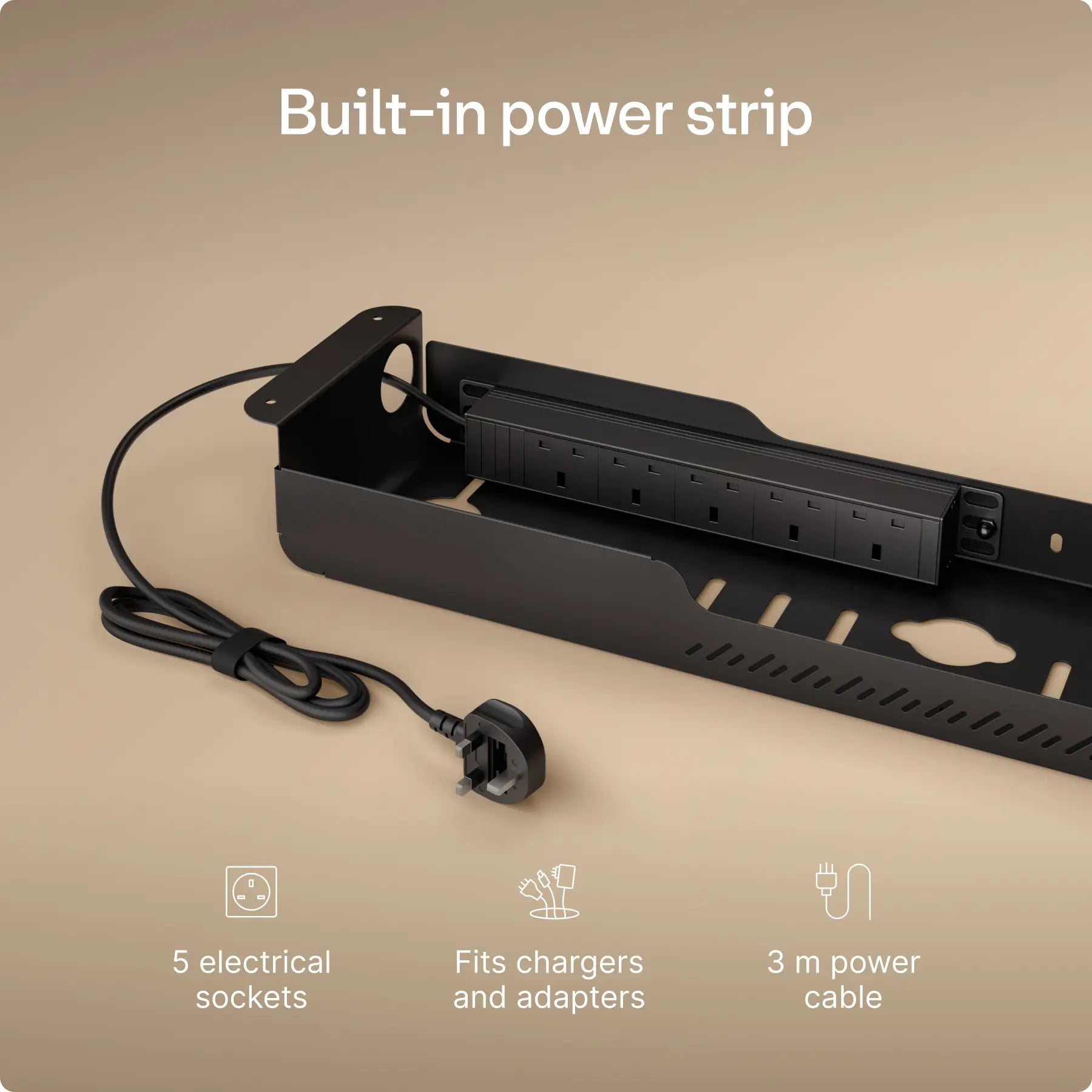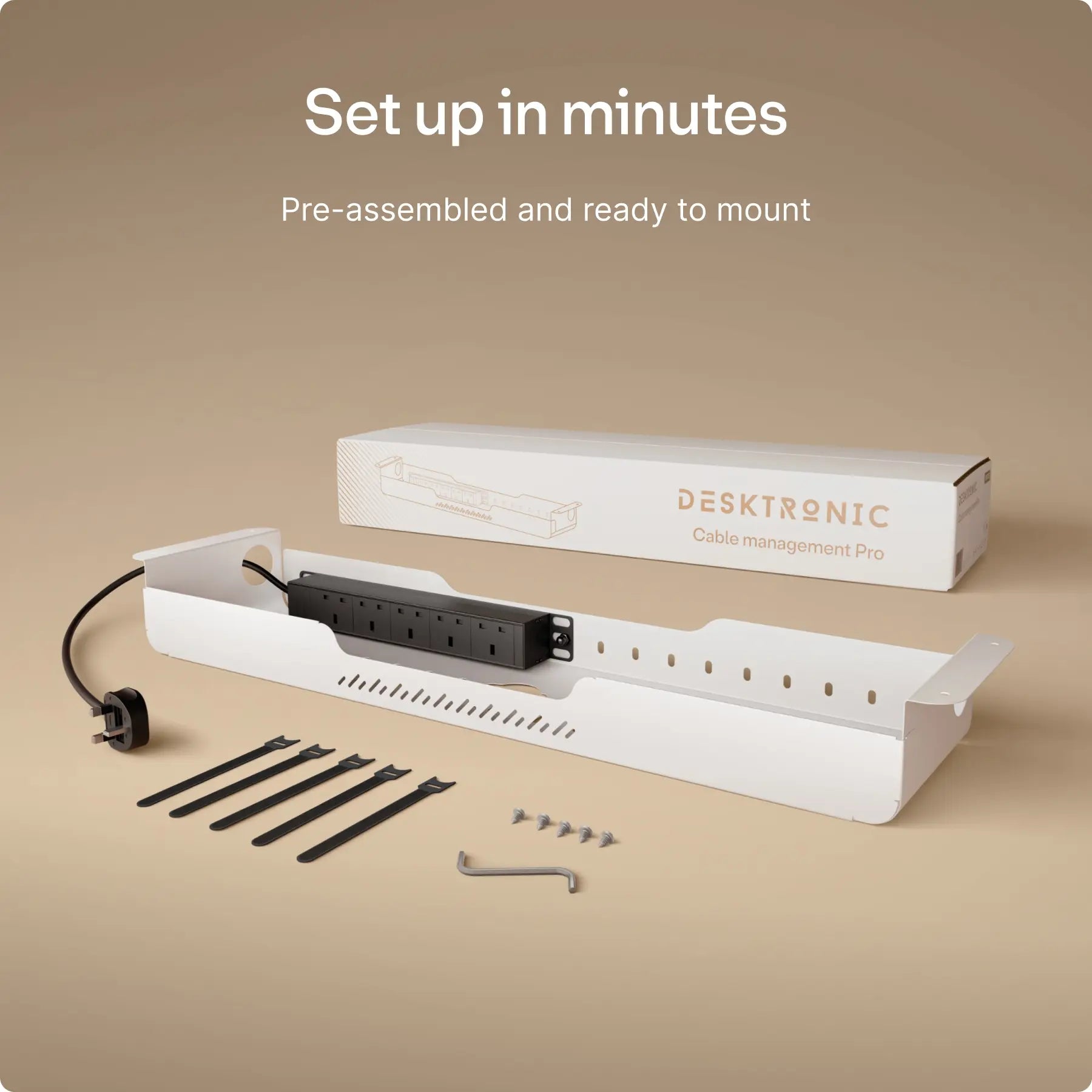 Installation is simple. Cable management Pro arrives pre-assembled and mounts neatly under your desktop using the included screws. Fix it in place in just a few minutes and you’re ready to go.