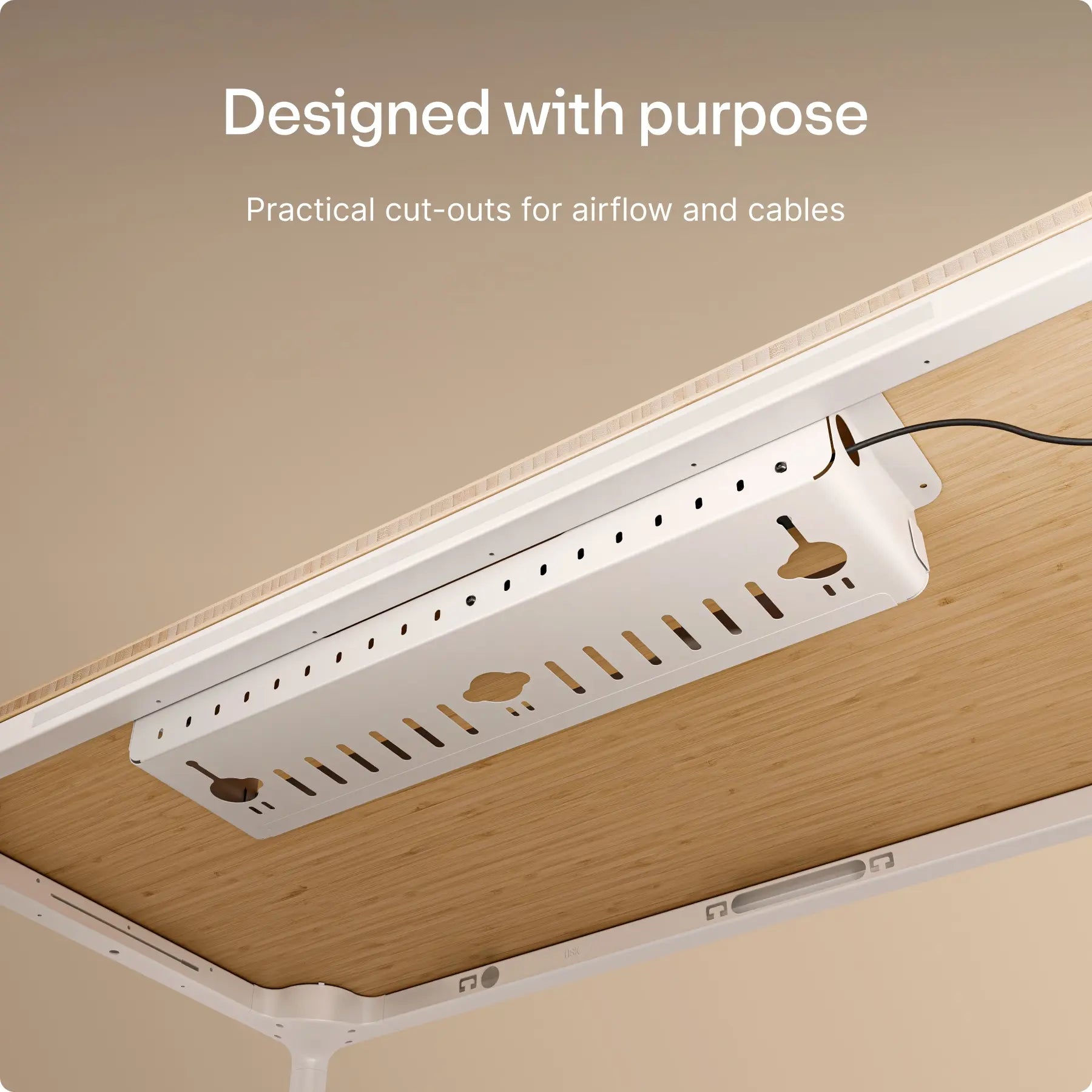 Yes. The under-desk cable management tray features cut-outs at the bottom that allow cables and wires to be routed in different directions and support airflow, helping prevent overheating.